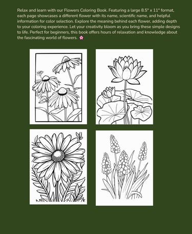 Introducing the Flowers Coloring Book - a perfect companion for folk who want to unwind and learn about the beauty of flowers. With its large 8.5" x 11" format, each page features a different flower along with its name, scientific name, and information about the flower to help you choose the perfect colors. Plus, you'll also discover the meaning behind each flower, adding a deeper level to your coloring experience.