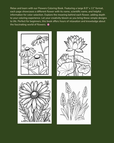 Immerse yourself in the world of flowers and let your creativity bloom as you bring these wonderfully simple designs to life. If you're just starting out, this coloring book is designed to provide hours of relaxation and enjoyment. Discover the therapeutic benefits of coloring while expanding your knowledge about the fascinating world of flowers.