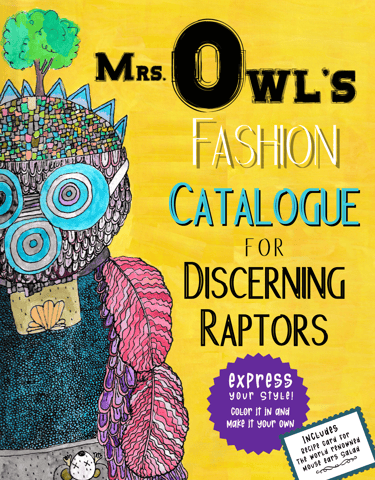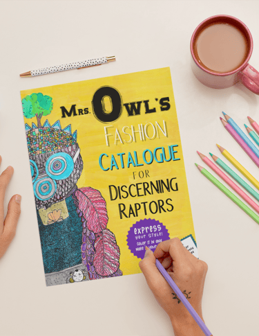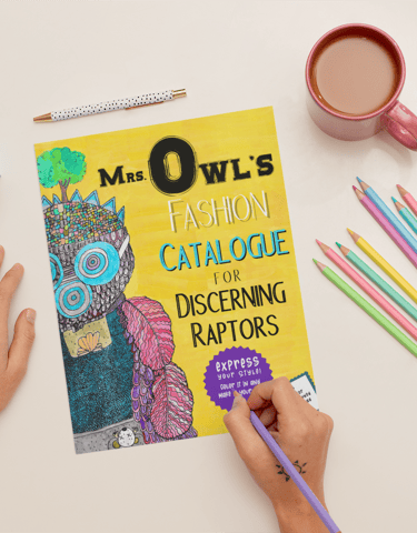 Mrs. Owl's Fashion Catalogue is hand drawn, and in black and white so that you can immerse yourself in coloring in all the detail filled pages. Over 48 pages in fact. And as Mrs. Owl says “We all have a different sense of what color and style suits our image best. I want you to release the creative in you and color up my catalogue. I want you to feel safe inside these pages, to know that there are calm pauses and stillness even in the turning tides of the sea and the storms of living.”